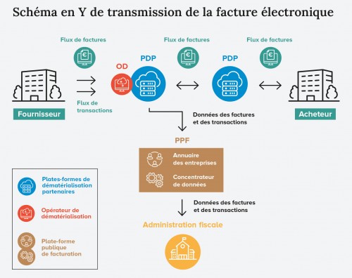 Les PDP se chargeront donc d’extraire les données utiles à l’administration fiscale et de les lui envoyer sur sa plate-forme, pour l’heure baptisée « portail public de facturation » (PPF). Le rôle du PPF consistera aussi à gérer l’annuaire répertoriant les entreprises et leur(s) PDP et à assurer la concentration et la transmission des données (cf. « Schéma en Y » ci-dessous).